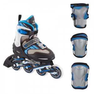 Раздвижные фитнес ролики для мальчиков Rollerspace Boy Combo с задним тормозом, выполненные в сером цвете с голубыми и черными акцентами. Комплектуются защитой кистей, колен и локтей. Мягкий ботинок с комфортным внутренним сапожком, высокий каф из ударостойкого пластика с фиксацией на затягивающуюся клипсу. Легкая, но надежная рама из алюминия оснащена полумягкими колесами 82А, диаметр которых зависит от приобретаемого размера – от 68 до 76 мм. Подшипники Abec3. Отличный комплект для города по самой доступной цене!