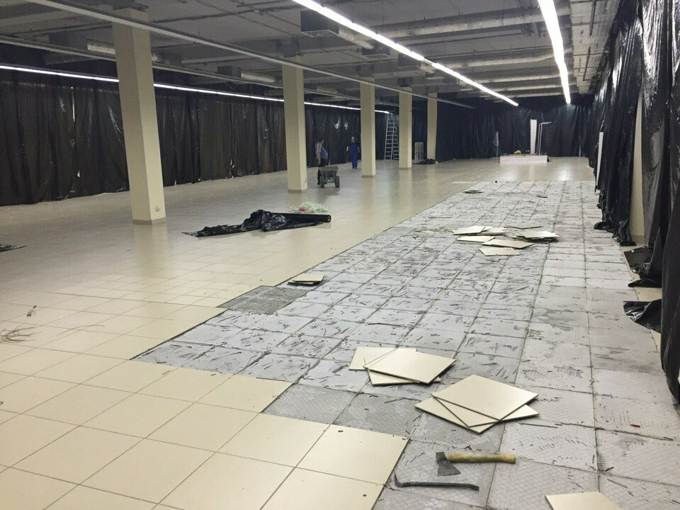 демонтировать полностью пол, согласовывать работы с руководством ТЦ, закрывать дром на 2 месяца, заливать пол заново. Смета около 6 млн рублей;закупить много фанеры, класть в 2 ряда внахлёст, пропитывать жидкостью, закреплять анкерами за плиту и наливать полимер, то есть создать имитацию жёсткого основания. Проект на 3 млн руб без гарантии результата.